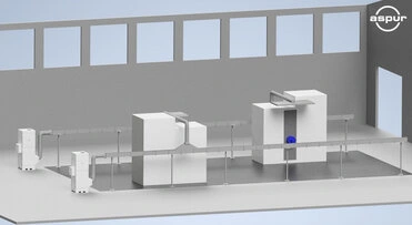 Absaugung von Ölnebel an modernsten Duplex Starrbettfräsautomaten mit einem Verfahrweg von ca. 20 Metern. aspur air solutions hat ein mobiles Erfassungssystem entwickelt welches eine Punktabsaugung der entstehenden Aerosole ermöglicht.
