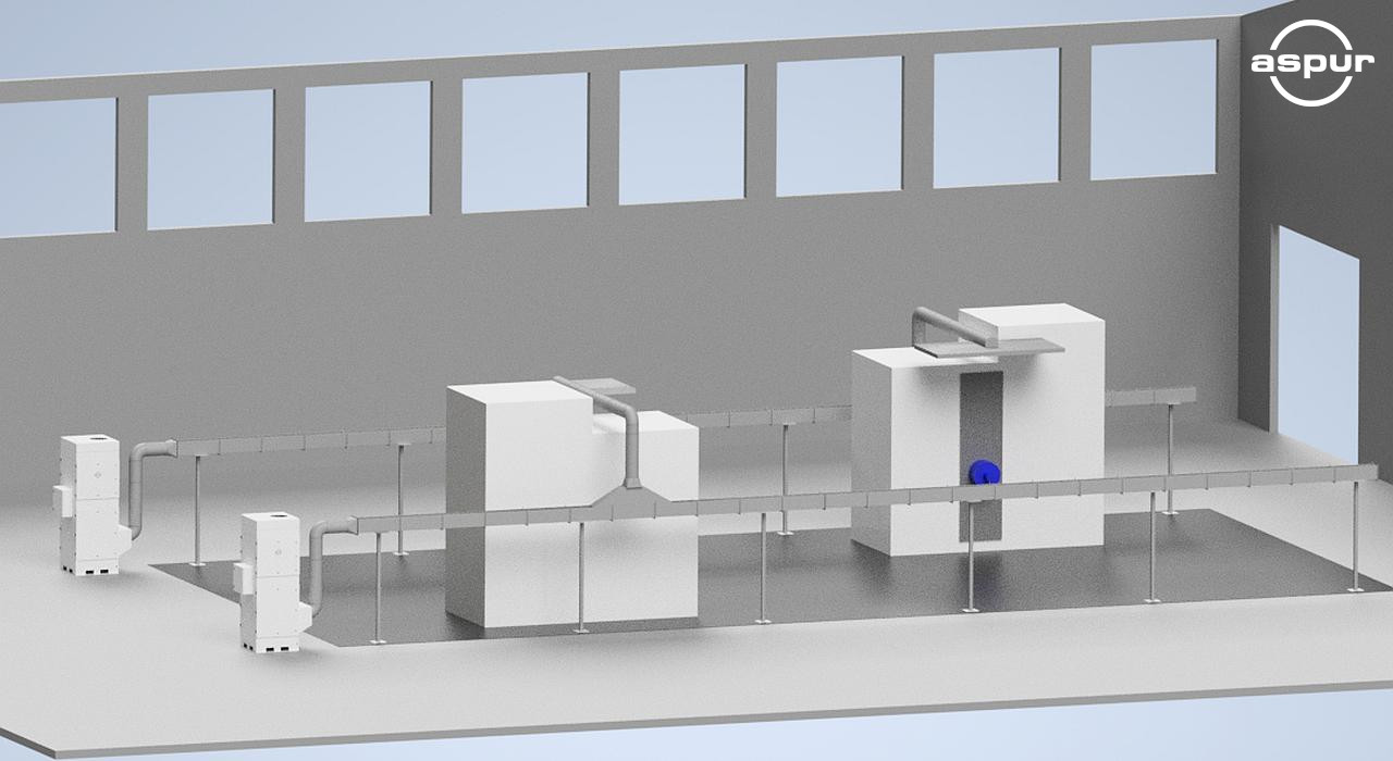 Absaugung von Ölnebel an modernsten Duplex Starrbettfräsautomaten mit einem Verfahrweg von ca. 20 Metern. aspur air solutions hat ein mobiles Erfassungssystem entwickelt welches eine Punktabsaugung der entstehenden Aerosole ermöglicht.